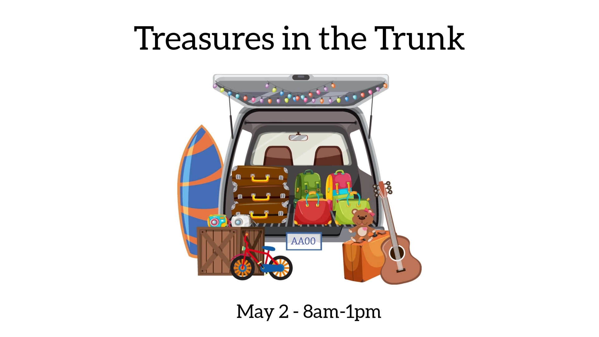 Join us for this garage sale out of your car! You pay per car to set up on May 10 from 8am-1pm. For an extra $5 we can provide a 2'x8' table. Have a table at own you want to use? No extra charge to bring it!